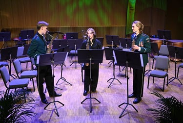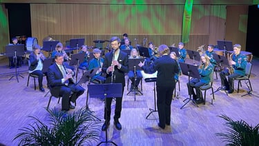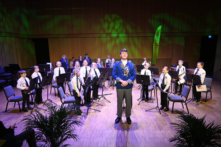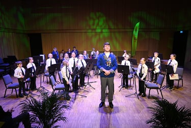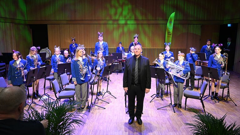 Alstad Skolekorps, hovedkorpset sammen med solist Joar Klæbøe Henriksen, dirigent Lill-Hege Nygaard.